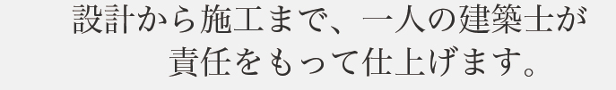 澤山建築はお客様との顔合わせから、住まいが出来上がるまで、一人の建築士が一貫してお客様と携わります。営業を通さず、直に建築士が何度もお客様と打合せをする為、伝達ミスもなくなります。 また、何度も接することにより、建築士との間により良い信頼関係が築け、お客様が思い描いている住まいを建てる事が現実のものとなります。